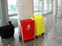 | これはなにか、と申しますと、会場でこんなカートを 「タダ」で配ってるメーカーがあるのです。プレスキットが かさばるので大変に重宝。 奥の黄色いのは、ミシュランが配布したもの。手前のはセアト。 ミシュランが入り口付近で配られていたため、 始めはほとんど のプレスがこれを引っ張ってましたが、「ただの袋にぐらぐら のタイヤがついただけ」で、非常に扱いにくい。 やがて、奥でセアトがもっといいのを配ってる、 というのがわかり、皆さん大急ぎで入手し重たい資料 を移し変える光景があちこちで展開しました。このセアト、 アルミフレームによく転がるタイヤで、みんなに非常に好評 を博していました。 |